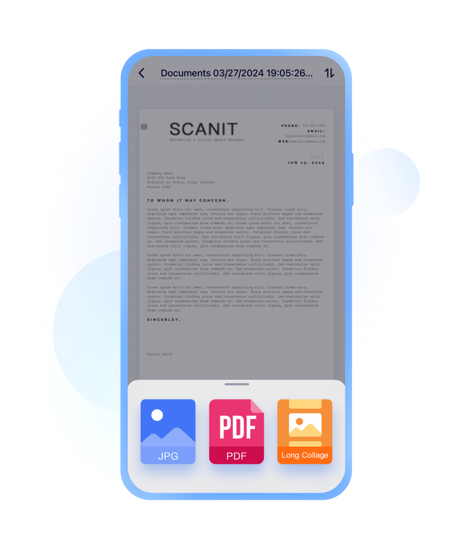 Scans can be exported in multiple formats: PDF, JPG, or Long Collage, and can be quickly shared with colleagues or friends via WhatsApp, Email, iMessage, and more.